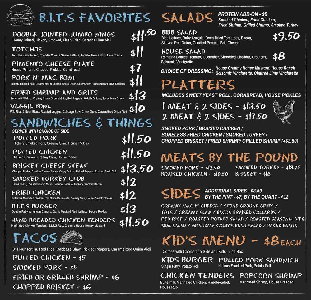 The menu features some of the food truck’s most popular dishes including — Totchos, Fried Shrimp and Grits, the Pork n’ Mac Bowl, the B.I.T.S Burger, and a variety of tacos. Platters, salads, and sandwiches will be introduced to the menu. Meats can be purchased by the pound, and sides can be purchased by the pint and quart.