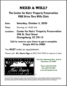 The Center for Heirs’ Property Preservation will be conducting a FREE Drive Thru Wills Clinic on Saturday, October 3rd at the Center for Heirs’ Property Preservation’s Orangeburg Office (396 St. Paul Street, Orangeburg, SC 29115) beginning at 10 am.