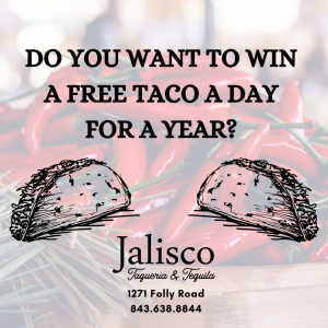 Jalisco Taqueria & Tequila is looking for the perfect marquee board message to display outside the restaurant on James Island and they’re asking for your help. If your idea is chosen, you’ll earn a free taco a day for a year!