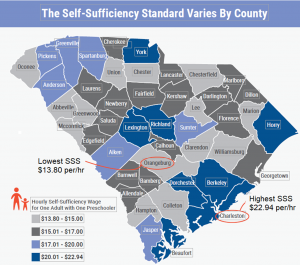 - The amount of income needed to make ends meet for one adult and one preschooler varies from $13.80 per hour in Orangeburg County to $22.94 per hour ($48,459 per year) in Charleston County based on federal poverty guidelines for a family of two.