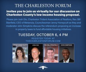 On October 6th, The Charleston Forum will speak with Josh Dix of the Charleston Trident Association of Realtors, Rev. Bill Stanfield, CEO of Metanoia, and Councilwoman Jenny Honeycutt, about racial inequalities as it pertains to economics and affordable housing in the Lowcountry and across the state.