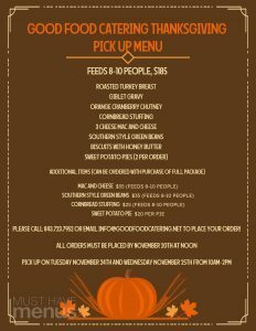 Holy City Hospitality and Events by Good Food Catering will be offering a Thanksgiving menu available for pick-up. The deadline to order is by 12 pm at November 20th.