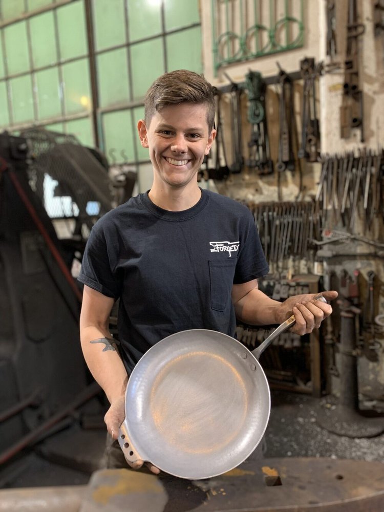 Blacksmith Annie Arthur (right) leads the division of forged steel cookware at Robert Thomas Iron Design located in the old Navy Yard in North Charleston. Occupying what was originally the facility’s tool and die shop, her base of operations has recently doubled and now takes up 10,000 sq.ft. Annie and her team, which engaged 4-6 assistants, have produced about 12” skillets over the past 24 months. Also, since about a year ago, they’ve made about 1000 14″ dual-handled oval roasting pans.
