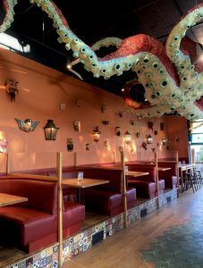 Fans of Wiki Wiki Sandbar’s third story beach views and private dining will enjoy the transformed Tiki Bar into Taco Boy’s Jaguar Bar, a tequila and mezcal lounge, and the redesigned Sunset Room, formerly private dining space, now featuring a kaleidoscope of colorful window panels (see photo above) and traditional Mexican art.