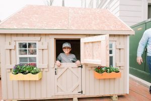 The completed playhouse will be a 9’ x 8’ structure with a porch and window boxes with flowers, as shown to the right.