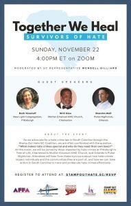 On Sunday, November 22nd at 4 pm on Zoom, panelists and attendees will come together from across the country for “Together We Heal: Survivors of Hate.” The event is hosted by the Stamp Out Hate SC Coalition.- Beth Kissileff, New Light Congregation, Pittsburgh