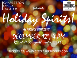 On Saturday, December 12th, from 4 pm to 5:30 pm, “Holiday Spirits!,” an event featuring operatic and traditional holiday favorites presented by Charleston Opera Theater, will be held at the Firefly Distillery in Park Circle.