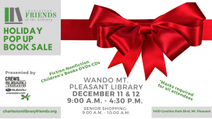 Looking for your next read and a way to support your local library? Shop great books for the upcoming holidays and support your library by coming to the Charleston Friends of the Library’s (CFOL) “That Holiday Book Sale” at the Wando Mount Pleasant Library (1400 Carolina Park Blvd, Mt Pleasant).