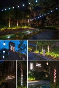 The display will include “laser-light ‘jewels’ that sparkle across the park’s pathways, planting, and fountain pool,” strings of large multi-colored globe lights, and words of inspiration and hope projected on the park’s walls and trees.