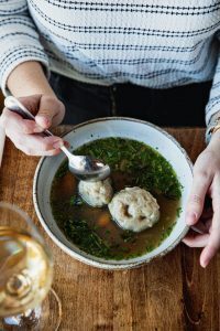 - Matzo ball soup with a Bee twist (above right)