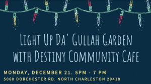 Destiny Community Café, Charleston’s only pay-what-you-can restaurant, is inviting you to celebrate the holidays by driving by their brand-new “Da’ Gullah Garden” for holiday lights, music, cider and more.