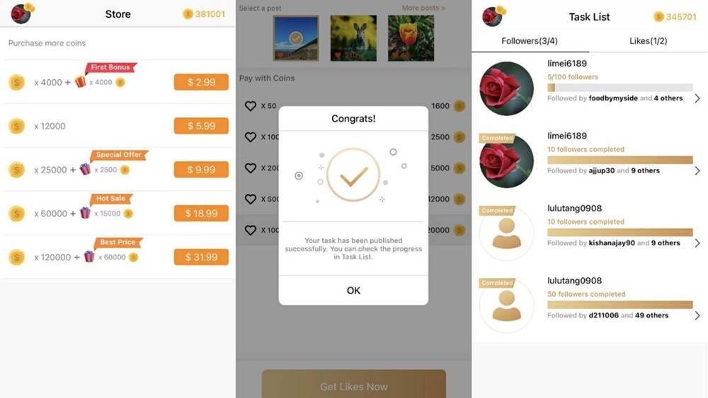 Step 6: Tap the coin-shaped menu to the ”Store Price Plan” page. On this page, you can spend money to buy coins and get unlimited followers & likes instantly after having enough coins.