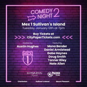 On Tuesday, January 12th at 7 pm, Mex 1 Coastal Cantina on Sullivan’s Island will host their next Comedy Night featuring comedians Doug Smith, Mona Bender, Daniel Armistead, Gabe Haynes, Tanner Riley, Nate Allen, and emcee Austin Hughes.