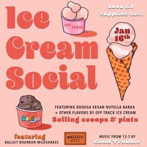The ice cream social will run from 12 pm to 2 pm (or while supplies last). Off Track will bring their ice cream cart to the downtown venue and will be offering scoops and pints of the new flavor. They will also be serving up Bulleit Bourbon Milkshakes while guest are entertained by the soul band, Good Trouble.