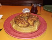 Another favorite at Flying Biscuit is the Chicken & Waffle platter. Three plump, all white crispy buttermilk chicken pieces layered over a fluffy Belgian waffle. Slather it with maple syrup or any other topping of your choice. Great for early morning entree or midday meal.