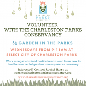 Charleston Parks Conservancy is looking for volunteers to help them with their Garden in the Parks series, which is held on Wednesday mornings from 9 am to 11 am at various parks throughout the City of Charleston. No experience is necessary.