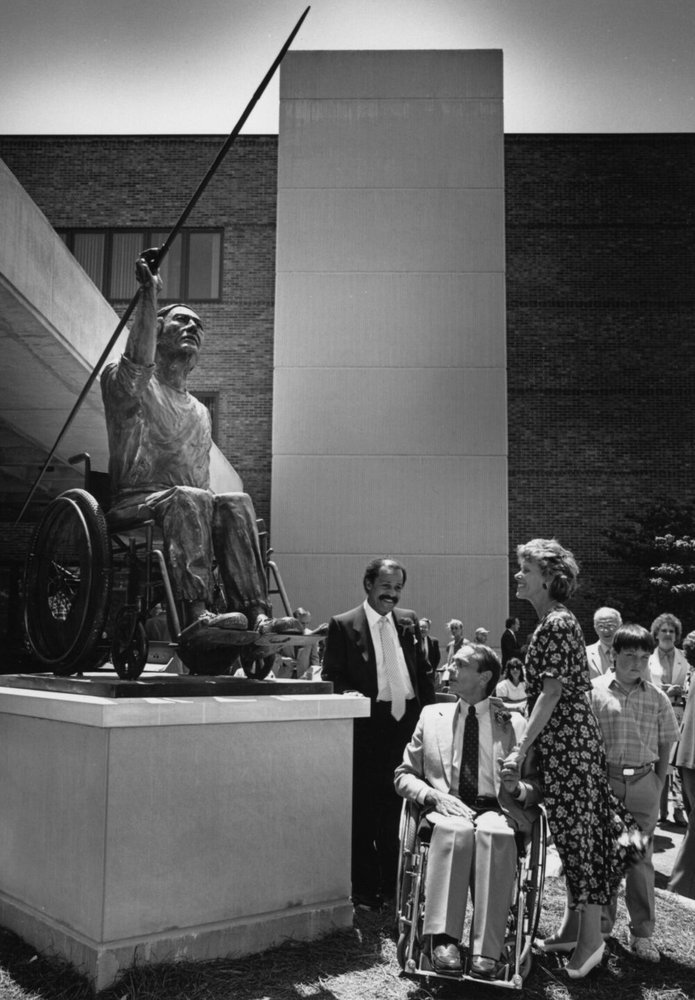This space is devoted to Blackville residents honored as Hall of Fame heroes. On view, for example, are two orange javelins that belonged to Terry Lee, a paralympic champion who was born and reared in Blackville. Lee was paralyzed from the waist down at age 13 after being shot in the back during a hunting accident. Lee’s determined rehabilitation led him to become a competitive javelin thrower and basketball player, and an inspiration to spinal cord injury patients at the Shepherd Center in Atlanta. A larger-than-life size statue of Lee (pictured at the end of this post) is on display at the entry of the Shepherd Center. In addition to his athletic prowess, Lee had a successful career with Adams-Cates Realty Co. in Atlanta, Ga. He passed away in 2016 at age 74, in the home he had built on his grandfather’s farm near Blackville.