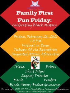 Krystal Klear Productions (KKP) will be hosting a virtual event called Family First Fun Friday: Celebrating Black History on Friday, February 26th, 2021 from 7 pm – 9 pm. This is a family-oriented event featuring an evening of trivia, prizes, short films, legacy tributes, music, vendors, and a Black history basket giveaway.