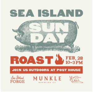 Post House Inn and Restaurant has partnered with Sea Island Forge and Munkle Brewing to host the Sea Island Sunday Roast on February 28th from 10 am until 3 pm.For the event, Chef Nathan Hood will be cooking a whole hog on a Sea Island Forge kettle outside on the Post House patio. The menu includes Fire Roasted Caw Caw Whole Hog with Green Mojo; Veggie Plate with Charleston Red Rice, Field Pea Ragu, Artisan Greens and Anson Mills Cornbread; French Toast with Macerated Berries, Maple and Walnut; PH Brekkie with Eggs, Roasted Bradford Collards, Grits, Toast, and Bacon; and Warm Crab Toast with Poached Eggs, Hollandaise, Espelette, and Green Salad.