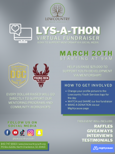 Lowcountry Youth Services, a community-based youth development organization, will be hosting its Inaugural LYS-A-Thon Virtual Fundraiser on March 20th, 2021. This event is an all-day celebration of the work the organization has done in the Tri-County Area since their inception in 2008, while also raising money for their mentorship and youth engagement programs.