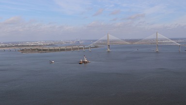 From the start, development of the project was impressive in terms of how efficiently plans were drawn up and funding approved by Congress in less than two years. Recently, Johnson went up on a Coast Guard helicopter to take a look and capture some images of the broad water span he manages. Eight to ten dredges are currently in operation. It is nothing short of awesome. This is a historic moment for the District with the unusual amount of dredge activity occurring. Normally, two to three dredges being in one harbor is impressive. This excitement comes as the District is celebrating 150 years of serving South Carolina and the nation, making it even more special.