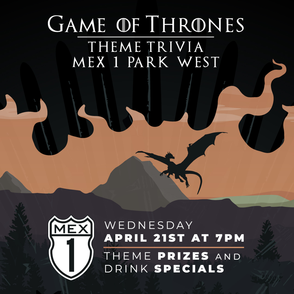 On Wednesday, April 21st, Mex 1 Coastal Cantina in Park West will host Game of Thrones Theme Trivia starting at 7 pm.