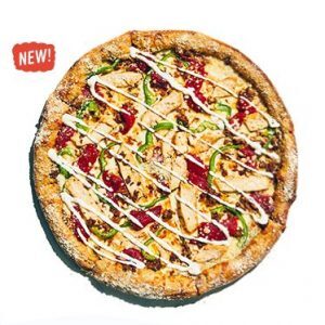 Maui Wowie – A pesto base with mozzarella, ham, pineapple, jerk chicken, banana peppers, and Applewood-smoked bacon.