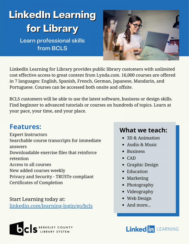 Berkeley County Library System announces the migration of Lynda.com to LinkedIn Learning. Learn new employment skills, brush up on a former study topic, or explore something new thanks to the more than 3,500 web-based video courses and step-by-step tutorials available through LinkedIn Learning.