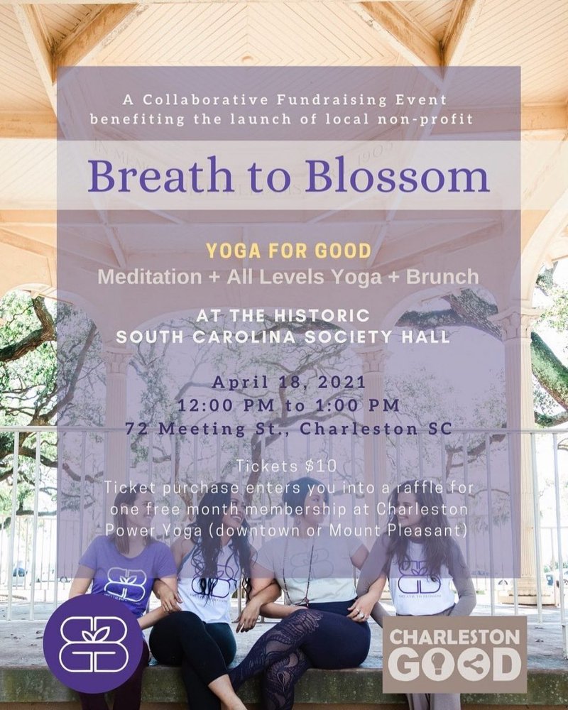 Breath to Blossom (B2B), a new local nonprofit, will host Yoga for Good, its official launch event, on April 18th at South Carolina Society Hall. The Saturday trifecta of meditation, all levels yoga, and brunch will be held in collaboration with Charleston Good and the aformentioned SC Society Hall.