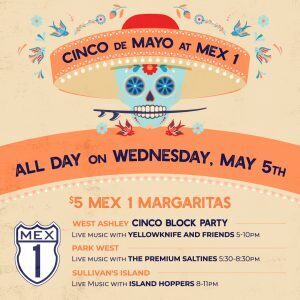 Mex 1 Sullivan’s Island will have live music with the Island Hoppers hitting the stage at 8 pm, while Mex 1 Park West will have live music with Premium Saltines starting at 5:30 pm.