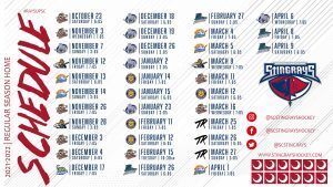 The Stingrays will continue to play all home Saturday night home games at 6:05 pm, as well as weekday games at 7:05 pm and Sunday contests at 3:05 pm. All dates, times, and opponents on the 2021-22 schedule are subject to change.