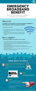 The Charleston County Public Library (CCPL) is working to help build consumer awareness about the Emergency Broadband Benefit, a new Federal Communications Commission (FCC) program. The temporary benefit will help to lower the cost of broadband service for eligible households during the on-going COVID-19 pandemic.