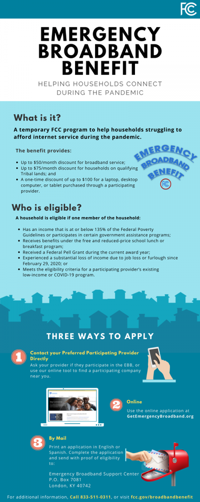 Emergency Broadband Benefit enrollment opened on May 12, 2021. Eligible households can enroll through a participating broadband provider or directly with the Universal Service Administrative Company (USAC) using an online or mail-in application. Additional information about the Emergency Broadband Benefit is available at www.fcc.gov/broadbandbenefit, or by calling 833-511-0311 between 9 am and 9 pm any day of the week.