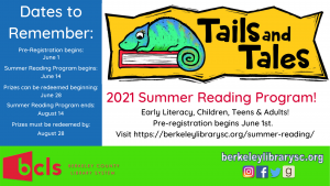 Berkeley County Library System’s (BCLS) 2021 Summer Reading Program invites preschool age to adult to participate in Summer Reading and win prizes. The 2021 theme is “Tails and Tales” and pre-registration begins June 1st.