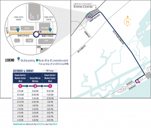 Landside Beach Reach parking will be located along Market Center Boulevard in Mount Pleasant Towne Centre. The seasonal park-and-ride shuttle will tie-in directly to the existing CARTA system at stop No. 715, a sheltered amenity located near the Belk Men’s store. Connections to Route 40 Mount Pleasant and Route 42 Wando Circulator will be available.