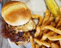 A half dozen burgers are on the line-up at Stones Throw. They all begin with a half pound 100% chargrilled all beef patty, with the standard cheeseburger (your choice of cheese), served with seasoned fries, and a kosher dill pickle spear for just $10.