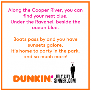 Contest Holy City Sinner’s Dunkin’ Scavenger Hunt – Clue 1 Published 5 years ago on May 24, 2021 By Holy City Sinner It’s National Scavenger Hunt Day and Holy City Sinner has partnered with Dunkin’ for Holy City Sinner’s Dunkin’ Scavenger Hunt! A few lucky Dunkin’ fans could win a summer of Refreshers and Iced Coffee…and more! Your first clue is below! Share on FacebookTweetFollow us Related Topics:Dunkin'Holy City Sinner's Dunkin’ Scavenger Hunt Up Next Mellow Mushroom Closes Summerville Restaurant Don't Miss Holy City Sinner’s Dunkin’ Scavenger Hunt Click to comment Leave a Reply Cancel replyYour email address will not be published. Required fields are marked *Comment * Name Email Website Follow Us Subscribe to HCS Subscribe to our mailing list Search PatreonAds HCS Sponsors Ads Events Weekend Preview2 years ago Charleston Weekend Events There’s ALWAYS something to do in Charleston – especially on the weekend. If you need help finding plans, just consult... Events2 years ago Explore Charleston & Children’s Museum of the Lowcountry Unveil The Charleston Santa Events2 years ago Waterfront Ice Skating Rink to Return to Charleston Harbor Resort & Marina Events2 years ago Miracle Holiday Pop-Up Bar Returns to Handcraft Kitchen & Cocktails This Month Events2 years ago Big Brothers Big Sisters hosts BIG Lowcountry Boil Events2 years ago Comedy Legend Katt Williams Returns to the North Charleston Coliseum in March Events2 years ago Parade, Vendor Applications Open for Upcoming ‘Holiday Magic’ Events Events2 years ago “Know Whatcha’ Know” Release Party & Fashion Show Set for Saturday Events2 years ago High Tide Music & Arts Festival Coming Back to Charleston for Third Year More Events