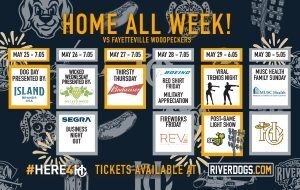 Friday, May 28, 7:05 pm: Fireworks/Red Shirt Friday/Military Appreciation Night: The RiverDogs will open the weekend with a gigantic tribute to military members on Boeing Red Shirt Friday. The team will make their new inductions into the Hall of Honor prior to the game and there will be a special performance of “God Bless America”. As always, we invite you to wear red in support of those who serve our country. The team will take part on the field, wearing special red jerseys. The night will be capped with another fireworks spectacular presented by REV Federal Credit Union. Friday games are presented by 103.5 WEZL.