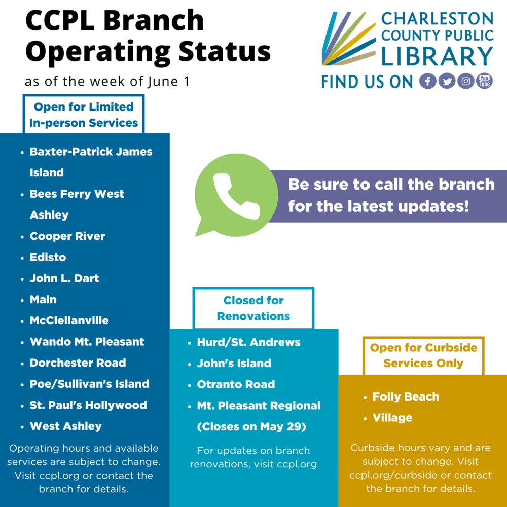 On Tuesday, June 1st, Charleston County Public Library (CCPL) will relaunch some of its operations expanding hours and pre-pandemic services, as well as offering free outdoor in-person programming to patrons. Indoor programs remain suspended at this time.