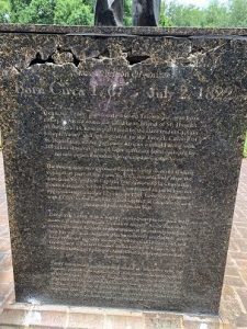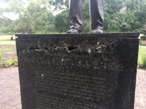 On Sunday, in response to citizen reports, city of Charleston police officers inspected the Denmark Vesey monument in Hampton Park and discovered significant damage to the statue’s granite pedestal (right).