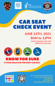 To help caregivers transport children as safely as possible, the North Charleston Fire Department, along with Safe Kids Charleston Area, MUSC Children’s Health, South Carolina DHEC and St. John’s Fire District, will be hosting a FREE car seat checkup event on June 12th from 9 am to 12 pm at North Charleston City Hall (2500 City Hall Lane).