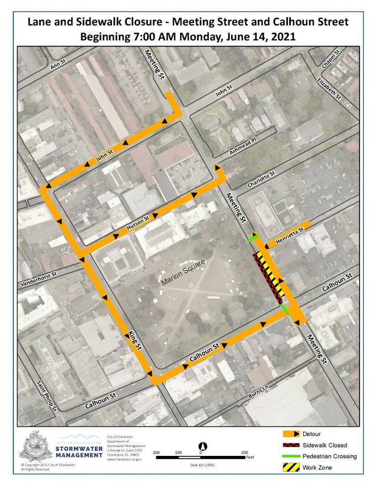 On Monday, June 14th, 2021, the City of Charleston Stormwater Service, the South Carolina Department of Transportation (SCDOT), and Charleston Water System will begin work on a sinkhole that will require closing the southbound lanes of Meeting Street at the intersection with Calhoun Street.