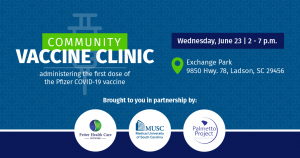 Fetter Health Care Network, MUSC Health and Palmetto Project are partnering to host a community COVID-19 vaccination clinic on Wednesday June 23rd from 2 pm to 7 pm in Ladson. The event will be held at Exchange Park (9850 Hwy. 78) and vaccinations will be free for all who are eligible. Currently, it is expected that 2,000 doses of the first Pfizer vaccine will be available.