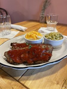 • Sriracha Meat Loaf with sriracha bbq drizzle, butter beans, and mac & cheese