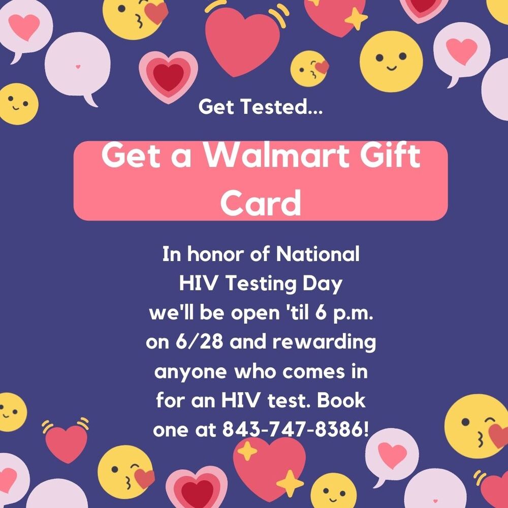 Palmetto Community Care is honoring National HIV Testing Day next Monday, June 28th with extended hours and a gift (WalMart gift card) for anybody who gets an HIV test.