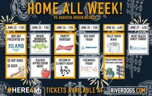 The first-place Charleston RiverDogs will return to The Joe for a series against the Augusta GreenJackets June 22-27. Believe it or not, when the series concludes, the team will be halfway through the 2021 home schedule. Time really does fly when you’re having fun!