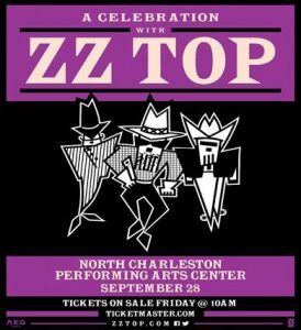 Rock & Roll Hall of Famers ZZ Top will perform at the North Charleston Performing Arts Center on September 28th.