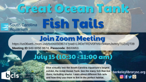 - Dive virtually into the South Carolina Aquarium’s largest exhibit, the Great Ocean Tank. See the many fish that live there, including sharks. Learn about different fish tails and how they use them to live in the perfect habitat. Join Zoom Meeting on July 15 at https://us06web.zoom.us/j/