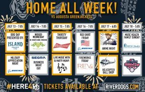 The Charleston RiverDogs will host games at The Joe for the first time in the month of July when the Augusta GreenJackets come to town for a six-game series July 13-18. The team will reach the halfway point of the 120-game season during the series. The RiverDogs own one of the best records in Minor League Baseball and lead the Low-A East’s South Division.