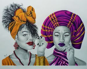In his first solo exhibition, Shattering the Stereotype, Christopher Kyle presents a collection of portraits celebrating black women. Working primarily with a black and white palette using charcoal and graphite, Kyle focuses on his subjects’ facial features and adornments, rather than their skin tone. “I purposely don’t show shades of melanin in my work,” he explains. “There is an unfortunate debate about the beauty of black people as it relates to the lightness or darkness of their skin. I eliminate that factor by keeping the people in my drawings the same shade.” Kyle often adds pops of color in his subjects’ clothing and accessories using Prismacolor to add drama and accentuate their natural beauty. “I want some little black girl (or woman) to see herself and how beautiful she is when she sees my work. I want some little black boy (or man) to see the beauty in our black women. I don’t want them to look in the mirror and hate themselves. Every time I create a black woman, I make sure she doesn’t merely break the stereotype. She shatters it.”